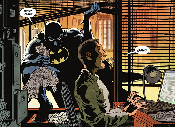 Du reste, l’enquête prend le lecteur à contre-pied à plusieurs reprises tout en étant extrêmement bien rythmée et en croisant les personnages secondaires initiés dans le premier volume (qui semblent être en route pour se connecter dans la conclusion). Les dessins d’Hayden Sherman contribuent à l’atmosphère si singulière de l’ensemble, mettant parfois mal à l’aise ou à l’inverse proposant une certaine originalité dans son découpage et ses points de vue (cette case avec les habitants qui scrutent Batman derrière leurs fenêtres ! – cf. ci-dessus), comme tout ce qu’il a instauré depuis le début, donnant une vraie identité graphique à la série (bien aidé par la colorisation de Triona Farrell).