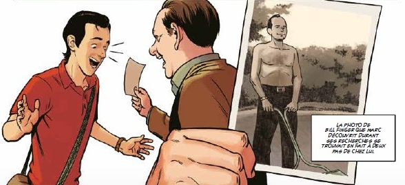 L’enquête de Noblehom, réécrite ici par Julian Voloj est passionnante – surtout pour un lecteur qui ne connaît pas toute cette histoire évidemment ! Le rythme est haletant, comme une intrigue de fiction soignée. Il faut dire, qu’en plus du travail de scénariste, la vie privée de Finger relève aussi d’un roman. Différentes femmes et un fils unique, peu connu avant les révélations de Noblehom. Pourtant ce fils, Fred, lisait dès l’âge de quatre ans les scénarios que son père écrivait sur Batman. Ce dernier les modifiait si son enfant les trouvait peu clairs. Les recherches de Noblehom conduisent aussi à découvrir une héritière « de sang », sa petite fille Athena, occasion idéale pour réparer l’injustice autour du crédit de Finger.