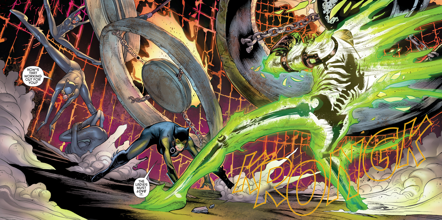 Selina Kyle jongle donc entre ces trois lieux et tribus, les affrontant tour à tour sans réelle intensité. Le look et les pouvoirs de Phosphorus ouvraient un champs des possibles assez vaste, surtout si Volt revenait aussi dans la partie. On ne sait d’ailleurs toujours pas très bien si la nouvelle version de Volt croisé dans l’ouvrage (aussi bien en civil qu’en « être avec ses capacités spéciales ») est réellement le même que celui du deuxième volume. Ce n’est jamais correctement expliqué même si Urban nous assure que oui dans la présentation des personnages des tomes trois et quatre (et même cinq). Mais quelques recherches évoquent plutôt Thaddeus Volt qui apparaît pour la première fois ici, donc il s’agirait d’une personne différente ? Dans tous les cas, que ce soit dans le volume précédent ou celui-ci, il n’y a eu aucun échange entre Catwoman et Volt pour expliquer cette situation (rappelons que Volt – compagnon de crime et de cœur de la voleuse – a été froidement assassiné par Gwendoline, sans que Selina le sache ni ne se préoccupe de sa disparition, et désormais réapparition, par la suite…).