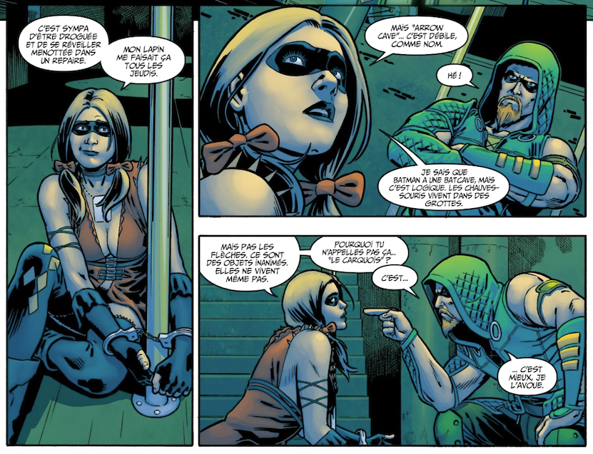 Seul point noir : une armée de dessinateurs se succèdent à tour de rôle. En vrac : Jheremy Raapack, Mike S. Miller, Bruno Redondo, Axel Gimenez, David Yardin, Tom Derenick, Diana Egea, Kevin Maguire, Neil Googe et Alejandro Gonzales, soit dix différents (et presque autant de coloristes). Certes, tous les protagonistes sont reconnaissables, bien aidé par leurs costumes emblématiques (idem pour les lieux : la Batcave, la Tour de Garde…), mais ça ne suffit pas à avoir une unité graphique. Les visages sont parfois hideux, parfois majestueux. Harley Quinn et Black Canary sont parfois hyper sexy, parfois plus « convenues ». Heureusement, la plupart des scènes d’action conservent leur dynamisme et lisibilité visuelle. Au même titre que le jeu vidéo, l’action est omniprésente, présentant de multiples combats (parfois inimaginables entre certains !) à bout de champ. Parfois cheap, parfois gore, souvent viscéral, c’est un vrai régal pour les amateurs !