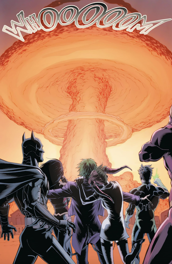Certains changent aussi de camp en fonction de l’évolution de la situation. Damian Wayne par exemple est plus enclin à rejoindre l’homme d’acier qu’à rester avec son père. A moins que des traîtres infiltrent les camps respectifs ? Les humains ne sont pas en reste (les parents de Clark, le président des États-Unis…) et d’autres figures familières sont de la partie, même si certains demeurent à l’écart de la guerre imminent. Aquaman par exemple semble rester en retrait sous la mer dans un premier temps (mais il n’est pas oublié de la fiction, il a bien droit à un chapitre). Quelques marginaux pointent leur tête (à découvrir dans les dernières images en bas de cette critique après l’explosion de Metropolis, à regarder en toute connaissance de cause donc).