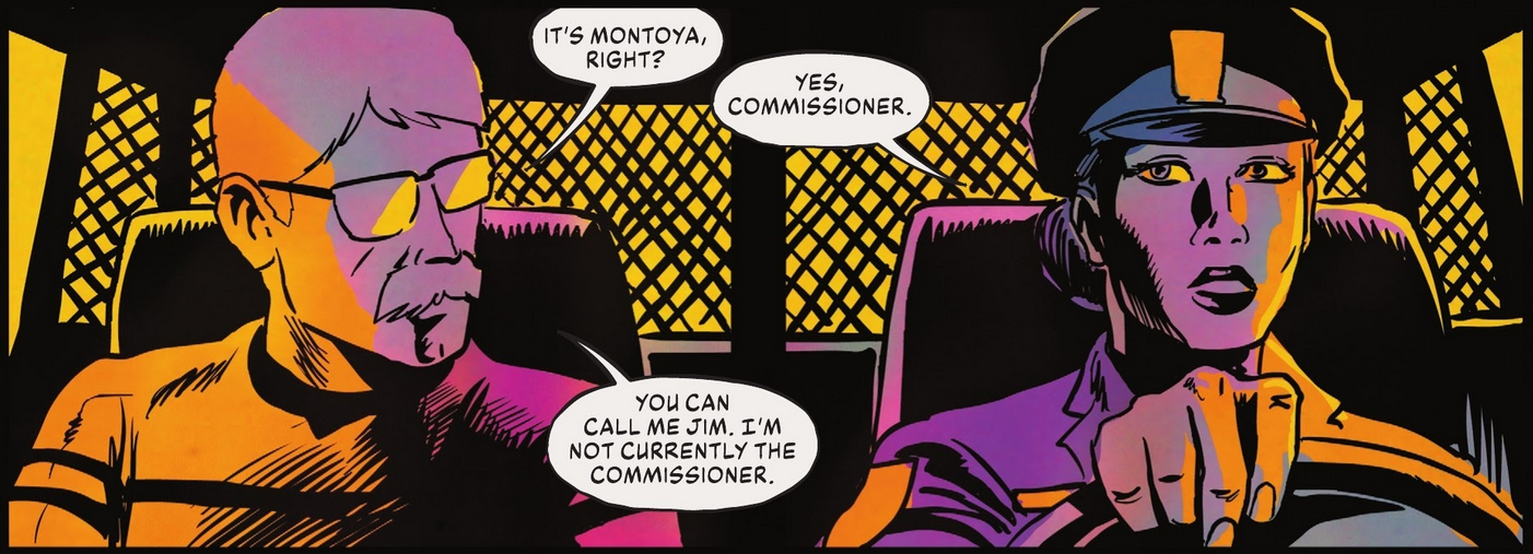 Le premier épisode est un long flash-back, dans la continuité de l’annual #1 qui fermait le tome précédent, revenant sur le quotidien de Gordon après Killing Joke. Sa cohabitation avec Barbara, le GCPD corrompu et… son fils James Jr. revenu au bercail familial, fasciné par le Joker. Tout ce chapitre est à nouveau dessiné, encré et colorisé par Francesco Francavilla et son style pulp inimitable aux tonalités chaudes, jeux de lumière efficaces et traits simples mais efficaces. Comme dans les deux volumes précédents, ce procédé graphique permet d’identifier immédiatement que cette partie du récit se déroule dans le passé.