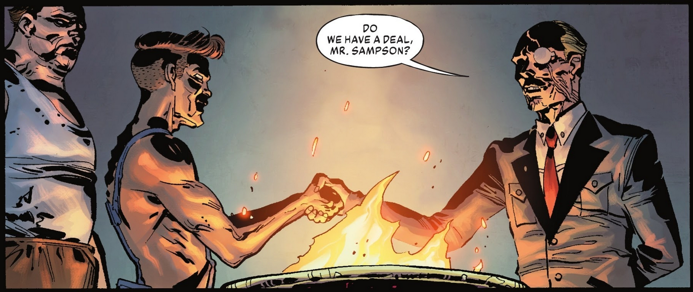 Revenons au troisième tome de Joker Infinite. Passé l’introduction sur le passé de Gordon, on renoue avec toutes les intrigues en cours qui trouvent chacune une résolution plus ou moins satisfaisante. Du côté des figures féminines de Gotham (Barbara, Julia, Orphan – Spoiler n’apparaît pas cette fois, étrangement), elles se connectent habilement avec l’enquête de Gordon sur le Réseau via un passage de flambeau et une entraide globale. Le fameux Réseau, justement, est mieux explicité, on comprend aussi les motivations de la Cour des Hiboux, ou plutôt de Cressida. La famille Sampson revient également sur le devant de la scène, là aussi on saisit davantage les connexions avec le reste du récit (en gros, les Sampson sont des cannibales mais le Réseau a besoin d’eux pour exploiter le pétrole sur leur terrain et, surtout, continuer de servir des mets humains à l’élite secrète urbaine – ça semble bordélique dit comme ça mais fait sens dans la BD). Et le Joker dans tout ça ? Un bouc émissaire déniché par Cressida qui veut faire tomber le fameux Réseau et qui a utilisé Vengeance, la clone de Bane, pour arriver à ses fins.