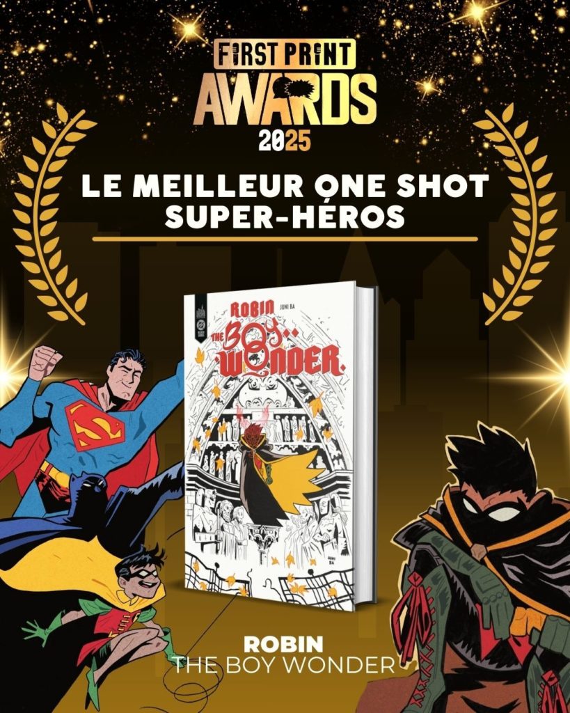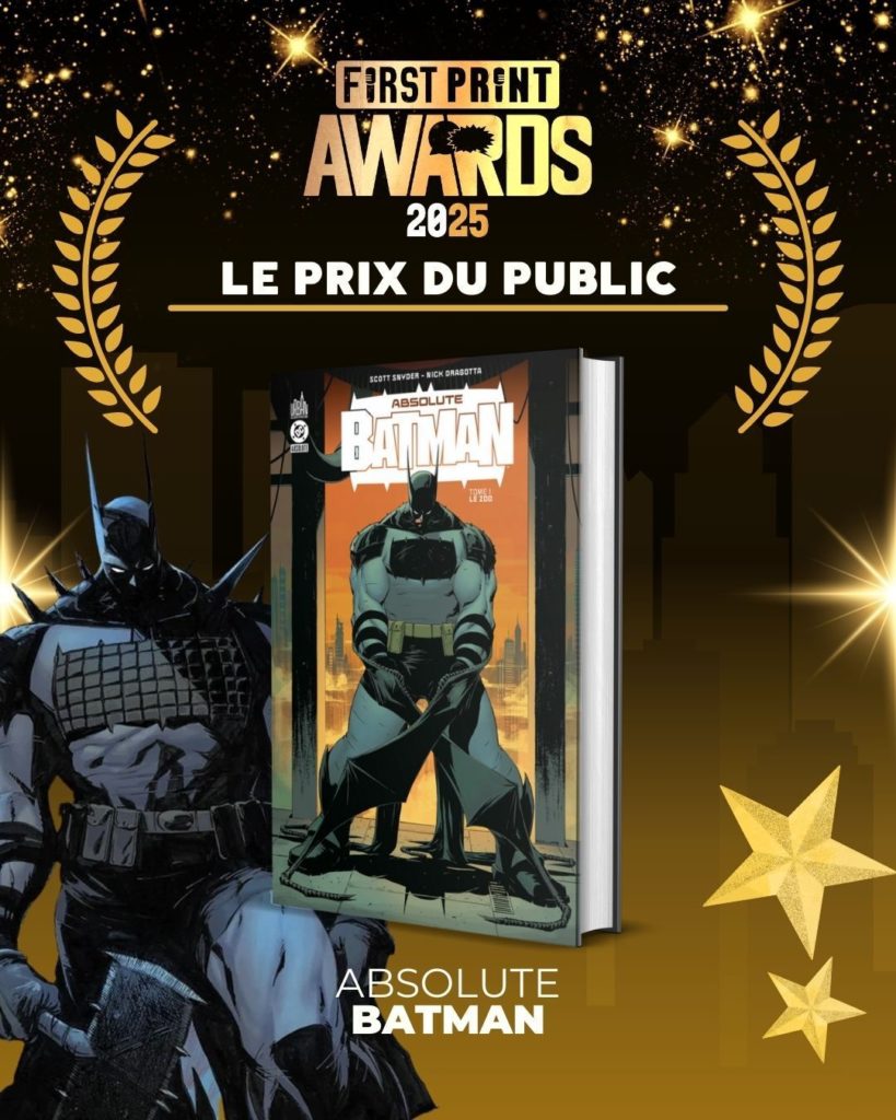 En marge de ce site, la seconde édition des First Print Awards a eu lieu le 5 décembre 2025. On en avait parlé sur la page Facebook de ComicsBatman.fr à l’annonce des lauréats pour le vote du public. Deux titres Batman ont gagné une récompense ! Ainsi, le premier tome d’Absolute Batman a, justement, récolté le prix du public (un titre qu’on avait beaucoup apprécié ici) et Robin – The Boy Wonder remporte le prix du « meilleur one shot super-héros » (une surprise pour l’auteur de ces lignes tant la bande dessinée m’a laissé de marbre – cf. chronique – mais l’ensemble des critiques restent élogieuses). Rendez-vous probablement fin 2026 pour une troisième édition organisée par Arno et Corentin, les deux podcasteurs et rédacteurs de First Print et ComicsBlog.